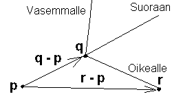 Tällä perusteella voidaan tehokkaasti ratkaista kääntymissuunta tasolla. Kuljettaessa tasolla pisteestä p pisteeseen q ja edelleen pisteeseen r on käännös keskimmäisessä pisteessä q oikealle jos (r - p) ×2D (q - p) > 0 eli positiivinen. Jos arvo on nolla, ei käännytä, vaan mennään suoraan.