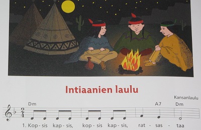 Intiaanien laulu Kopsis kapsis, kopsis kapsis, ratsastaa intiaanit ratsuillansa vuorten taa. Kuu jo nousee metsän takaa, puissa tuuli soi. Kukaan meitä pakoon päästä ei nyt voi. Nimekseni Haukansilmä kerran sain, kymmenen on kotkan sulkaa otsallain. Punainen on mahkani, vaan ratsu valkea. Yössä kaikuu pöllön huuto kauhea. |