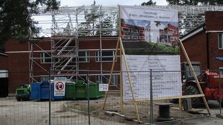 Täällä Porin Vähäraumassa, kaiketi entisessä Teknillisen opiston asuntolassa Tekunkorvessa on jo nyt toinen eli B-talo (oheisessa kuvassa vasemmalla) remontissa. Kyseessä on myös jonkinlainen laajennus. Ilmeisesti B-talo aiotaan yhdistää A-taloon (kuvassa oikealla) koska A-talon päädyssä on jo reikä ja kattoa rakennetaan talojen välin päälle.