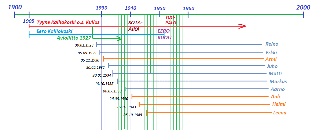 Kalliokosken perheen tapahtumat kriittisen tärkeänä ajanjaksona suunnilleen 1940 ... 1960 ovat minulle edelleen hiukan epäselviä. Tuolloin perheen kymmenen lasta olivat itsenäistymässä, monet avioitumassakin ja lähdössä maailmalle omaa onneaan etsimään. Aionpa kuitenkin tässä esittää jonkinlaisen karkean ja alustavan aikajanan Kalliokosken perheen vanhemmille ja heidän lapsilleen, kertomuksen sisaruksille. Ehkä se tekee sisarusten elämän alkutaipaleen hahmottamisesta helpompaa?