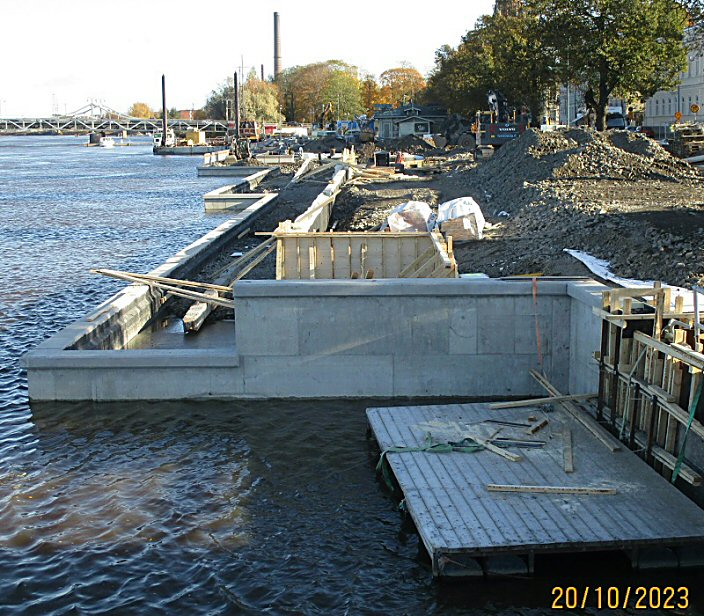 Taavi-silta kuitenkin ehkä piankin hinataan pois talviteloilleen, koska sen toiselta puolelta on jo veneiden kiinnitykseen käytettäviä poijuja poistettu, joten lie korkea aika esittää syksyn viimeiset kuvat rakennustyömaasta.