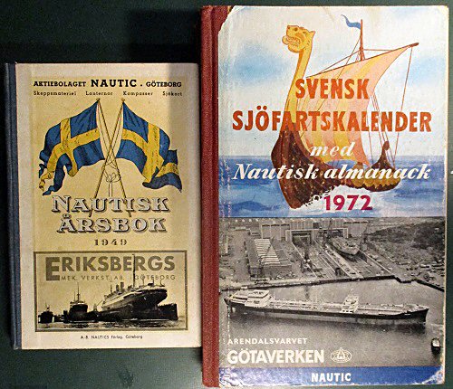 Hazarde mi posedas du malnovaj svedaj navigaciaj jarlibroj, "Nautisk årsbok 1949" kaj "Svensk sjöfartskalender med Nautisk almanack 1972". Ili estas iom aliaj en enhavo.