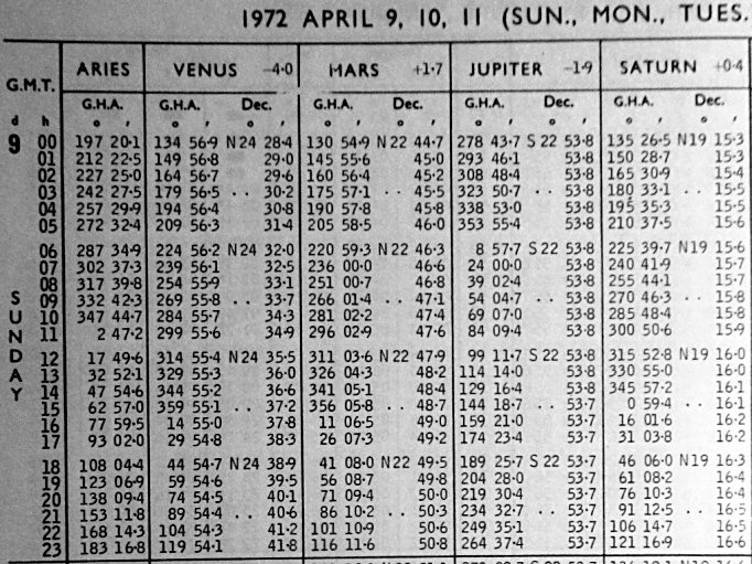 Nature la navigaciaj libroj ne estas konstruitaj por la tasko por kio mi ilin uzas. La navigaciaj libroj vere ekzistas por navigado sur la maro. Tamen eblas uzi ilin ankaŭ por trovi la proksimumajn direktojn de planedoj. Miaopinie estas senrajte por uzi la jarlibrojn nur dum unu jaro. Eblas ja bone utiligi ilin por studi ĝeneralajn astronomiajn cirkonstancojn por la jaro.