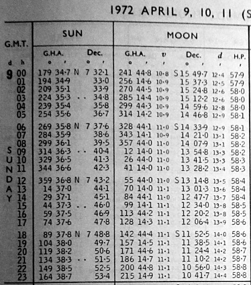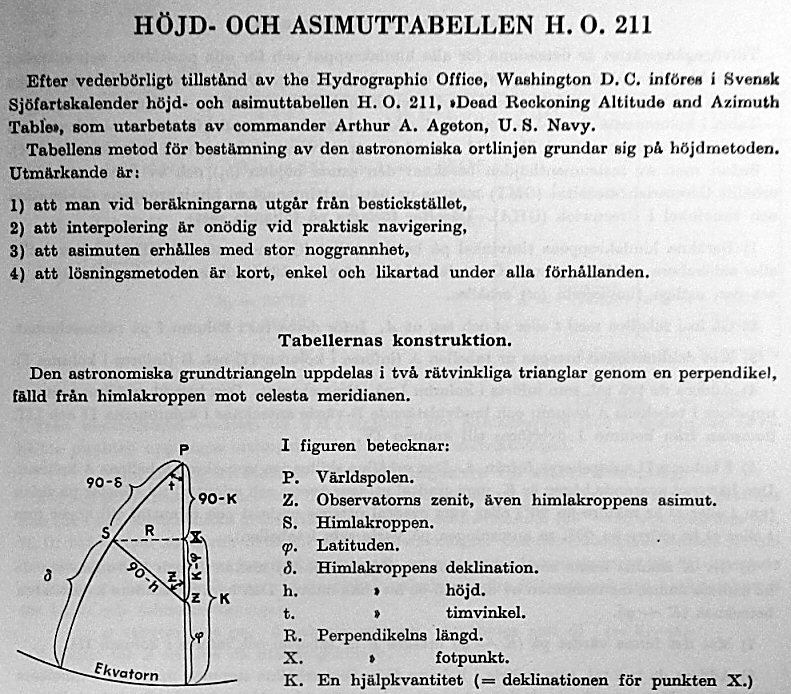 Nun mi tamen devas unue lerni por uzi la tabelojn de H.O. 211 ( de Hydrographic Office ) kiojn la libro por jaro 1972 enhavas. Ili helpos nin por trovi la horizontajn koordinatojn por la objektoj.
