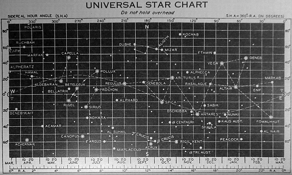 Sur la stelmapo tamen la angulo de navigistoj, la SHA ("Sidereal Hour Angle") kreskas maldekstren. Egalas ja RA = 360° - SHA kaj ankaŭ al alia direkto SHA = 360° - RA. La anguloj RA kaj SHA do kreskas al kontraŭaj direktoj.