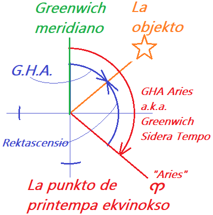 Ni povas uzi la apudan desegnaĵon por kompreni kiel oni kalkulas rektascension (RA), se oni scias la horangulon de objekto en Greenwich, la valuon GHA por la objekto.