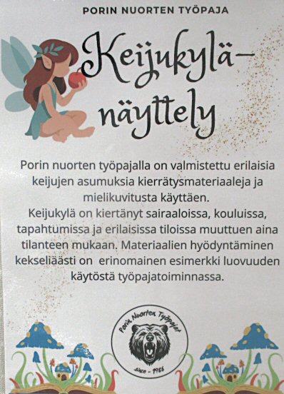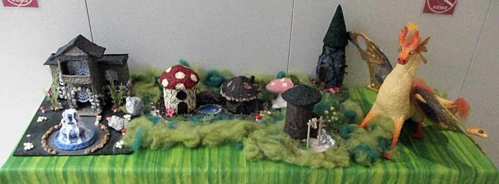 En la biblioteko de urbo Pori estis en aŭgusto junulara ekspozicio pri la vilaĝo de elf(in)oj kaj fe(in)oj. Nu, kredeble la artist(in)oj plej bone scias kia tia vilaĝo vere estas. Jen iom da ilia vidaĵo pri la serioze grava temo.