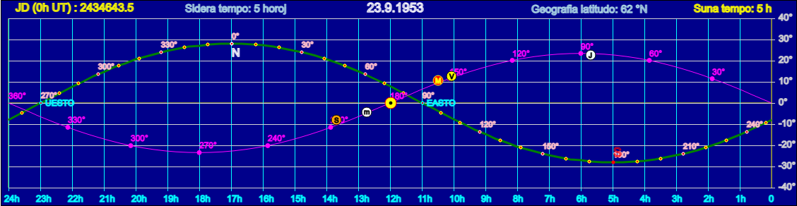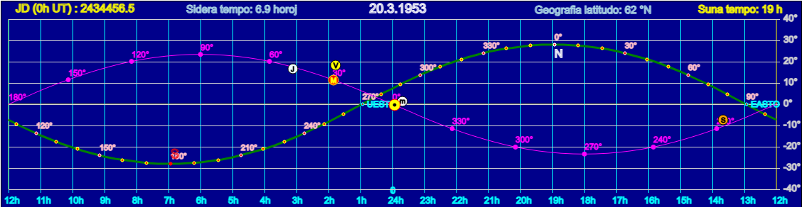 Tamen ekzistas ioma problemo kun la tempoj. La programo kalkulas koordinatojn nur por 0h Universala Tempo. Mi tamen uzis iom aliaj UT-tempoj por desegni la mapojn mane, helpe de navigacia jarlibro. Indas kontroli la rezultojn por 0 horoj UT. Nu, nenia superabunda problemo, estas ja bone por denove iom testi la rezultojn, ĉifoje por la jaro 1953.