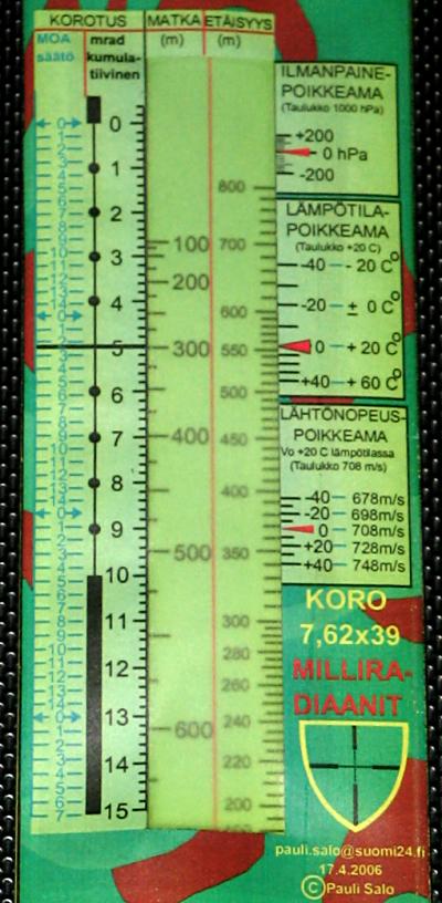 Här ser vi två sådana, för det finska stormgevärets kaliber 7,62x39. Denna kaliber är ju ingen skärskilt bra verkiliga skarpskyttarens verktyg. Räknestickan till vänster gäller för patroner med den ganska fina kulan S309. Kanske kan man resultatsrikt skjuta med den ändå till 600 - 700 meter med en mycket bra stormgevär som är utrustad med optiskt sikte? (Det finns också bättre vapen för skarpskyttaren)
