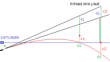 Alltså vid den nya riktningens distans d2 stiger pipans linje med c2 när träffpunkten på den distansen möter siktlinjen.