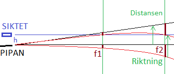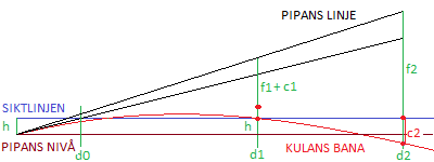 Först är distansen d1. Där faller kulan höjden f1 från pipans linje och träffar siktlinjen. Vi vill emellertid att kulan skall träffa siktlinjen på distansen d2 efter att ha fallit höjden f2 från pipans linje.