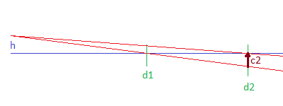 Hur förändras situationen i den nya riktningen? På distansen d2 försvinner c2, eller blir lika med noll. På distansen d1 växer pipans linjes höjd med c1. Pipans linjes och siktlinjes skärningspunkt d0 blir inte det samma och därför kunde vi kanske försöka räkna den nya punkten d0 så här h : d0ny = (f2 + h) : d2 = (f1 + c1 + h) : d1 men jag tror inte att vi kommer att behöva den.