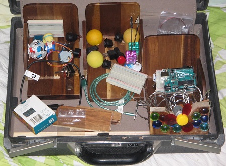 Yksityiskohtaiset toteutukset vielä hakevat itseään, mutta sähkömoottoreiden demosalkkuun on määrä tulla kolme Arduino Uno -yhteensopivaa mikrokontrollerikorttia kukin ohjaamaan omia moottoreitaan. Tuuletinta pyörittävään DC-moottoriin tulee PWM-jännitteensäätö joka samalla myös säätää oikealla näkyvien värillisten lasikoristeiden takana puurtavia LEDejä. Siellä on (alunperin leikkuulautana toimineeseen) akaasia-puiseen levyyn upotettuna 16 vetreää väritöntä valodiodia indikoimassa pulssimuotoisen 490 Hz tasajännitteen keskimääräistä tai tehollista suuruutta. Tällä järjestelyllä pyritään suotuisaan taiteelliseen vaikutelmaan. Jos oikein pinnistän niin pystyn ehkä tunkemaan sinne vielä pari LEDiä lisää.
