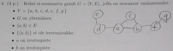 Tuossa ratkaisussa jos viiva <a, b> poistetaan, niin graafi on edelleen yhtenäinen, eli joukko { <a, b> } ei ole irrotusjoukko. Toisaalta jos poistetaan piste a tai piste b, niin se katkaisee graafin kahteen komponenttiin, joten sekä a että b ovat kumpikin erikseen irrotuspisteitä. Helppoa kun sen oivaltaa.