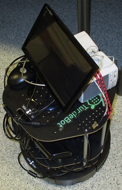 Vasemmalla näkyvään TurtleBot-robottiin emme ole vielä tutustuneet. Luultavasti siinä on ROS käytössä. Tämä vehje oletettavasti pystyy liikkumaan pienine pyörineen hitaasti omin voimin tasaisella vaakasuoralla lattiapinnalla, vaikka en olekaan sitä nähnyt toiminnassa. Siinä on oma akku. Siinä näkyy olevan myös kaiuttimet mukana. Ehkä se haluaa tehdä työtään laulellen?