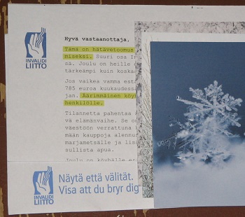 Rahasta on ilmeisesti pulaa muillakin kuin minulla. Nyt viimeksi Invalidiliitto arveli että minä varattomana ja ulosotossa olevana opiskelijana mukamas olisin sellainen älyttömän äveriäs Rockefeller että minullahan sitä pätäkkää piisaa enemmän kuin kotitarpeiksi. Ihan nimellä osoitetun kirjeen nämä hyväntekeväisyyden pohjattomat kaivot lähettävät.