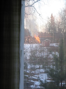 Oheisissa vanhoissa kuvissa yllä vasemmalla nuorisoseuraintalo Sampolan kentän pääsiäisvalkean alkuhetket kuvattuna tuvan ikkunasta huhtikuussa 2009, myllyn entisen lasku-uoman, saaren ja joen yli. Punainen uimakoppi on joen vastarannalla. Oikealla viereisessä kuvassa on isän perintötilan rippeet keväällä 2009 jolloin toivoa paremmasta vielä oli. Enää ei ole.