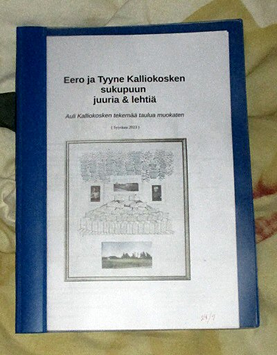 Nimittäin syyskuisessa jutussa 27.09.2023 lupasin pyhästi duunata kuntoon tätini Aulin sukutaulua käsittelevän PDF-tiedoston, josta voisi paperille tulostetuna koostaa kokoon ehkä vielä paremman (joskin sisällöllisesti oleellisesti saman) Kalliokosken sukutaulun, keskittyen äidin puoleisiin isovanhempiini Tyyne & Eero Kalliokoskeen, ulottuen heidän tunnettuihin edeltäjiinsä ja lapsiin, lastenlapsiin saakka. Tärkeimpänä lisäyksenä Aulin taluun on kuva Eero Kalliokosken kototalosta mummelini Tyynen kototalon (Kullas/Raskula) kuvan rinnalle.