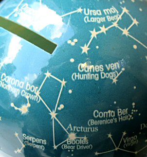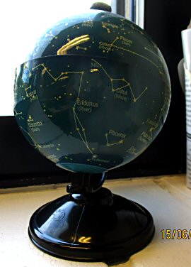 Siellä kansalaisopiston kurssihuoneen ikkunalaudalla tapasin ohessa kuvatun pienen tähtikarttapallon. Tosin se taitaakin olla säästölipas tai rahankeruuastia? Kuvat ovat ongelmaisia. Kattovalojen (pitkät vanhan liiton loisteputket) heijastukset kiiltävästä pinnasta vaivaavat. Ensin ihastuin siihen, sitten katsoin tarkemmin ja vihastuin. Tavallaan hyvä idea, mutta huono toteutus. Tähtitaivas on kuvattu väärin päin. Tähtikarttapallonhan pitäisi olla kartta päittemme yläpuolella olevasta taivaasta. Niinpä katsojan oikea paikka on karttapallon keskipisteessä.
