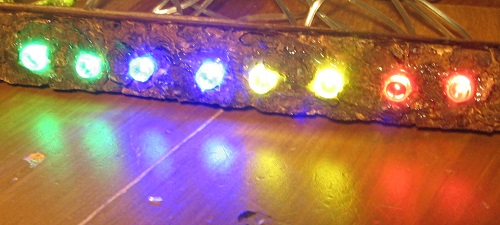 Apude ni vidas 8 LEDoj kiuj lumigas samtempe, en ordo du verdaj, du bluaj, du flavaj kaj du ruĝaj. Por mia okulo ili ĉiuj ŝajnis same brilaj. La fotilo eble ne estas tre sentema por blua lumo.