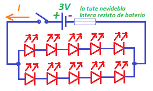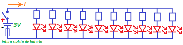 Fakte la skemo de tiu LED-ornamaĵo devas esti kiel la dekstra desegnaĵo. Ĉiuj la LEDoj fakte estas paralelaj. Nenia reostato estis videbla sed mi tamen desegnis protektaj reostatoj por LEDoj. Mi pensis ke la LEDoj povas konsumi nur maksimume 0,7 V da tensio. Ne eblas konekti diodon sen reostato kiu limigas kurenton!