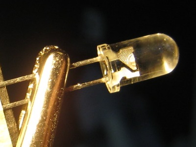 Maldekstre ni vidas foton de tia stranga LED kiu ne brilas. Ia strukturo de tavoloj estas videbla. Eble estas 4 ordinaraj LEDoj ene en la sama ujo en serio? Tiam la suma ŝtupa tensio estus proksimume 4*0,65V = 2,6V.