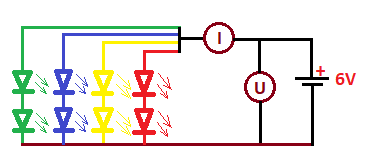 Tensio por unu LED do estas proksimume 5,78 V / 2 = 2,89 V kaj la kurento tra unu LED 17,8 mA / 4 = 4,45 mA , almenaŭ meznombre. Ĉi tiu aranĝo ja ne atestas ke la kvalitoj de LEDoj de malsamaj koloroj estus tute samaj. La tensio estas la sama, sed la kurento tra LEDoj de malsama koloro povus esti iom alia. Ni ja mezuras nur la sumon de 4 kurentoj.