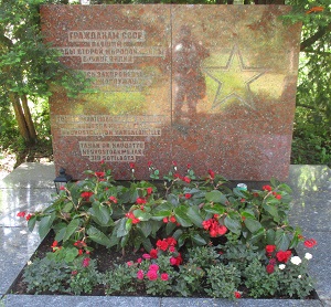 Maldekstre la tombejo de 319 sovetiaj soldatoj de dua monda milito. Iu jam forigis la malnovajn mortajn florojn kaj purigis la lokon post la Tago de Venko, la naŭa tago de monato majo. Vivo, ĝi ne daŭras tiel longe.