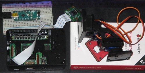 Do RPi gvidus la fotilon kaj Arduino gvidus la servomotorojn. Mi kredas ke RPi povas informi por Arduino kiel oni devas veturigi la motorojn se oni volas sekvi la movon de io objekto.