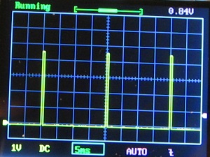 La bluaj rektanguloj de osciloskopaj fotoj estas nun 5 milisekundoj larĝaj kaj 1 volton altaj. La pulsoj do ekiras ĉiam en 20 milisekunda intertempo kaj la plej alta tensio estas proksimume 4½ voltoj. La unua foto prezentas la pulsojn en la pinto D3 kiam la en programo skribita valuo estas nulo. En la unua foto la pozitiva pulso daŭras nur unu milisekundon kaj la direkto de akso de motoro estas en unu rando. En la dua foto la skribita valuo estas 180, la pulso daŭras 2 milisekundoj kaj la direkto de akso de motoro estas en la alia rando.