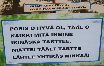 La apude fotita anoncŝildo proklamas en dialekta finna lingvo kiel bona la urbo Pori estas por loĝi kaj vivi. Laŭ la iom optimisma teksto ekzistas nenia vera kialo por adiaŭi la urbon kaj veturi ie alie.