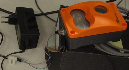 Mi kuplis elektran fonton por la optika sensilo per du dratoj. Tensio +12 voltoj en la viola drato kaj tero en la verda. Signalo por komputilo iras tra USB-konektilo.