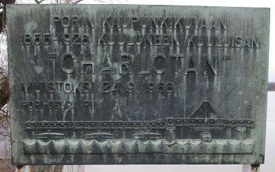 Ĉe la ŝtala ponto estas ankaŭ memora ŝildo por la malnova ligna flosponto Charlota. Societo por la urbo Pori produktis ĉi tiun memoran ŝildon en 24.09.1966. La sube fotita ŝildo do estas 8 jaroj pli juna ol mi.