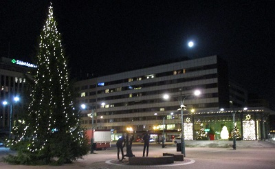 Julo jam pasis sed la lumigita jula piceo ankoraŭ ornamas la forumon de urbo. La Luno estas videbla sur la ĉielo. Veteroj estis relative varmaj, neĝo nur provizora.