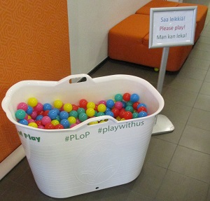 La multaj pilkoj, la globoj de diversaj koloroj en la granda blanka korbo evidente estas precipe intencitaj por ludado.