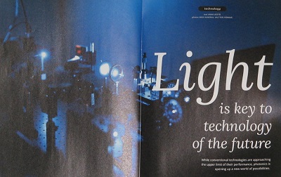 Lumo, ege grava temo. La apude fotita artikolo el malnova gazeto de Universitato de Tampere temas pri "photonics". Miaj propraj revoj ne estas tute tiel ambiciaj, sed temas pri lumo, jes. Mi kredas ke lumo estas ia ŝlosilo por la tekniko de estonteco. Mi povus mem bone labori per la tekniko de hodiaŭa tago, per elektroniko.