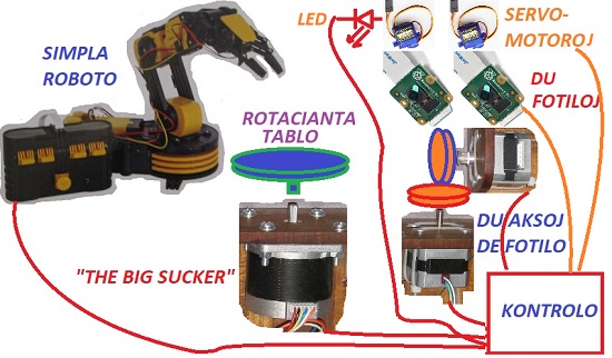 La sistemo havus simplan roboton, kelkaj apartaj elektraj motoroj de diversaj tipoj, kelkaj fotiloj, kelkaj IR-LEDoj, rotaciantan tablon, bonan stativon por la fotiloj, fortigilojn kaj kontrolilon. Mi provas apliki la principojn de dispartiĝitaj sistemoj en la programoj. Ĉi tio estos mia humila oferaĵo por la alta altaro de sankta kvara industria revolucio.