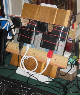 La stativo kun la bruna tranĉtabuleto de fajna eksterlanda akacia ligno klinas el vertikalo proksimume 30° malantaŭen. La blanka kablo inter la du nigraj ujoj de komputiloj estas norma rekta Ethernet -kablo, sed la ruĝa konektilo dekstre kaŭzas ke la du komputiloj povas paroli unu al la alia sen ia "Ethernet-switch". La du malgrandaj picamera -fotiloj estas preskaŭ vertikale en siaj nigraj ujoj.