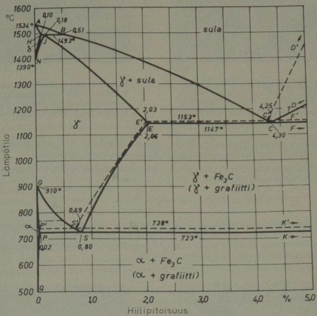 Jen grava iom malnova diagramo pri ŝtalo. En la horizontala akso de diagramo estas porcio de karbono (ĥemia simbolo C) en procentoj, 0 ... 5%. Ŝtalo ĝenerale havas maksimume 2% da karbono. Tradicie oni nomis feron kiel 'gisfero' se estas pli ol 2% da karbono. Gisferon oni ne indas forĝi, ĉar estas fragila. La multaj atomoj de karbono iamaniere difektas la metalan strukturon de fero, pro ilia alia grando. Se estas tre multe da karbono en fero, ekzemple 5%, la rezulto certe estas teknike neuzeble malbona.