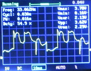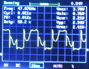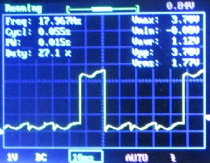 En la fotoj de osciloskopa ekrano estas la tempo horizontale 10 milisekundoj por kvadrato, do sume la osciloskopo montras 120 ms da tempo.