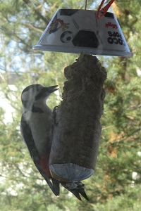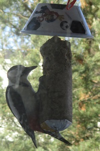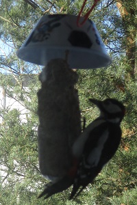 Ĉiuj birdoj ne kapablas sidi sur la preskaŭ vertikala manĝaĵo. La renversita taso sur la manĝaĵo detenas la pli grandajn kaj malpli oportunajn birdojn por uzi la manĝaĵon rekte. Nun ekzemple la malbelaj kornikoj ne povas sidi sur la manĝaĵo por ĝin manĝi. Mi boris truon al centro de taso kaj ŝnuro tra la taso subtenas la pendantan tutaĵon. Ankaŭ tra la tuta manĝaĵo estas ŝnuro.
