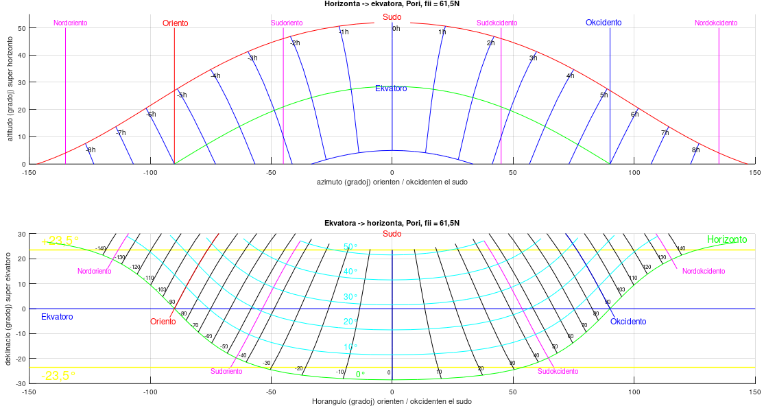 Sekve mi provos produkti iom da utila grafiko kun programo "GNU Octave" pri la rilato inter azimuto kaj hora angulo por diversaj altitudoj de Suno ( por la urbo "Pori", geografia latitudo φ = +61,5° ). Sube estas unu el miaj unuaj provoj por prezenti krude kiel aperas la ĉielaj koordinatoj (horangulo kaj deklinacio) en horizontaj koordinatoj (azimuto kaj altitudo).