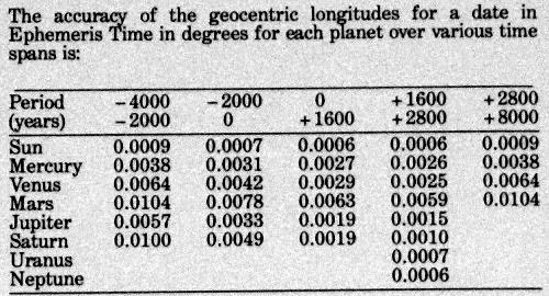 Sube estas pli da informo pri la precizeco de tercentraj longitudoj por diversaj planedoj kaj diversaj tempoj. Kredeble la granda avantaĝo de metodo estas la relative bona akurateco ekzemple por la jaro -4000, do por tempo 6000 jaroj antaŭ la jaro 2000.