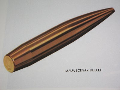 Lapua Scenar GB528, cal .338 (8,59mm) vikt 19,44 gramm, v0 = 830 m/s BC (G1) = 0,785 BC (G7) = 0,377