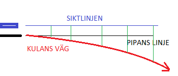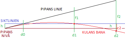 Pipans raka linje träffar siktlinjen på distansen d0, där kulan ännu stiger i luften.
