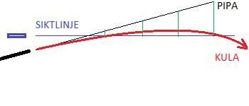Då kulan kommer ut ur pipan, är det praktiskt taget under siktlinjen lika mycket som siktlinjen är ovanför pipan. Då träffar kulan siktlinjen första gång, är det något under pipans linje, men inte mycket. Kulans höjd över siktlinjen blir nu lika med pipas linjes höjd över siktlinjen på det avståndet minus kulans läge under pipans linje. Sedan börjar kulans nedåt fallande rörelse verka mera än pipas linjes uppåt förande verkning och då har kulan redan nått sin banas högsta punkt. Efter det träffar kulan siktlinjen andra gången och då är kulan under pipans linje lika mycket som pipans linje är över siktlinjen. Efter det faller kulan under siktlinjen och faller ner med ännu ökande fart. Efter riktningens distans blir kulans nivå under siktlinjen lika med det vad kulan har fallit från pipans linje minus det som pipas linjes höjd är över siktlinjen på det avståndet.