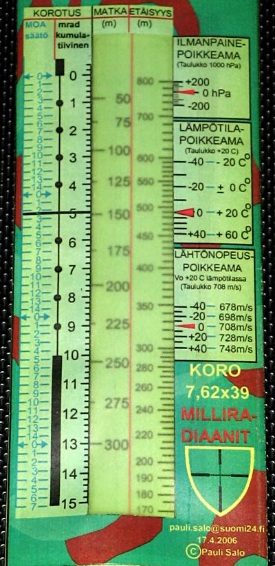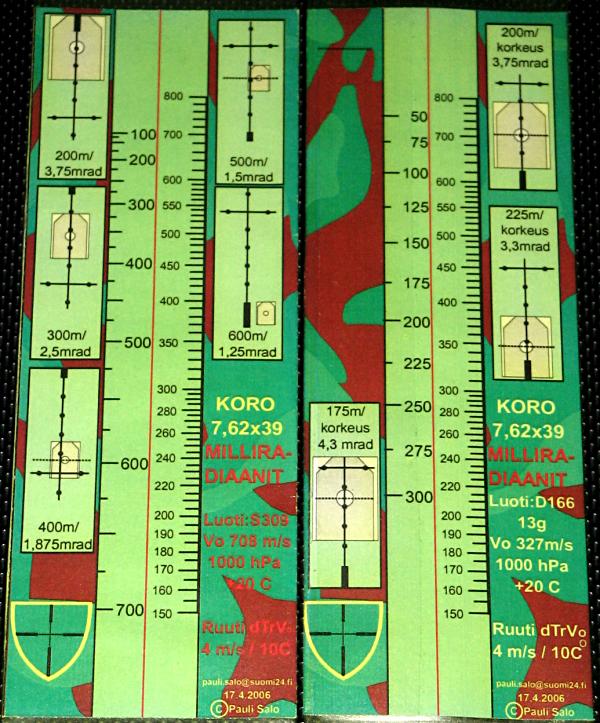 Här ser vi två sådana, för det finska stormgevärets kaliber 7,62x39. Denna kaliber är ju ingen skärskilt bra verkiliga skarpskyttarens verktyg. Räknestickan till vänster gäller för patroner med den ganska fina kulan S309. Kanske kan man resultatsrikt skjuta med den ändå till 600 - 700 meter med en mycket bra stormgevär som är utrustad med optiskt sikte? (Det finns också bättre vapen för skarpskyttaren)