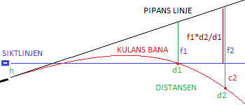 Först är distansen d1. Där faller kulan höjden f1 från pipans linje och träffar siktlinjen. Vi vill emellertid att kulan skall träffa siktlinjen på distansen d2 efter att ha fallit höjden f2 från pipans linje.