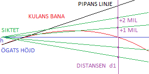 Eller kanske skulle man önska kulans bana för en lite olik ögats höjd över pipan? Skillnaden blir troligen i praktiken ganska liten, men i princip borde man kunna lösa det. En ingenjör skall absolut kunna det och jag vill bli en ingenjör. Jag skall attackera problemet i ett senare tillfälle.