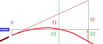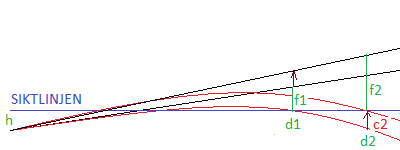 Vi vill ju lösa c1 från relationen, alltså hur mycket kulan är över siktlinjen på distansen d1. Jag tror att det går så här (f1 + c1 + h) = (f2 + h) · d1 / d2 eller c1 = (f2 + h) · d1 / d2 - f1 - h .